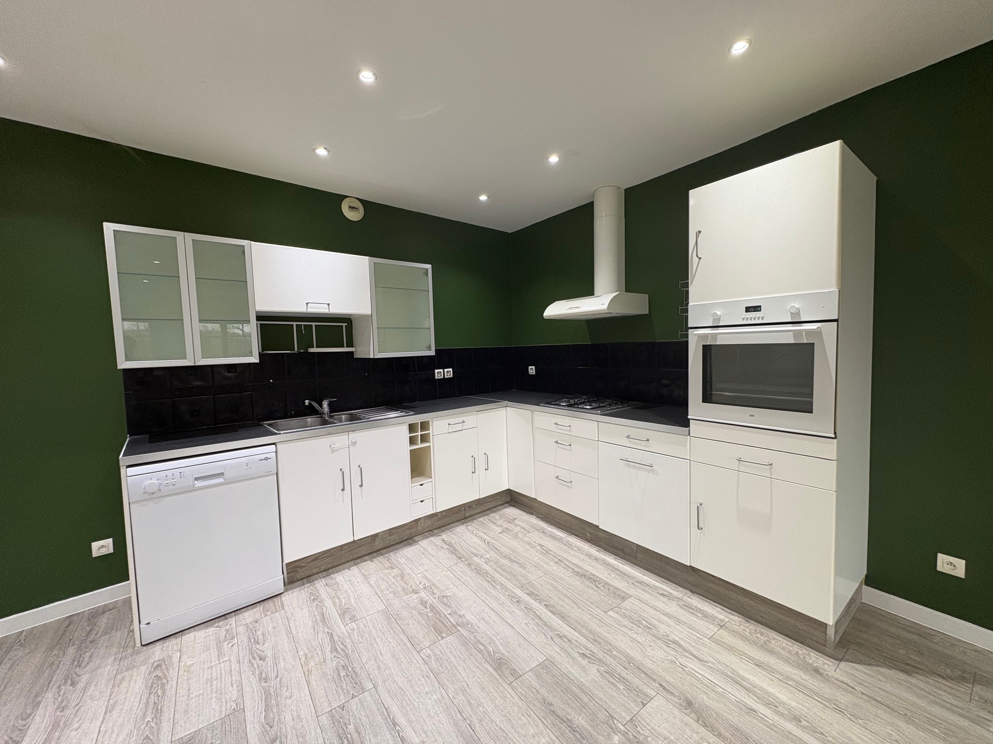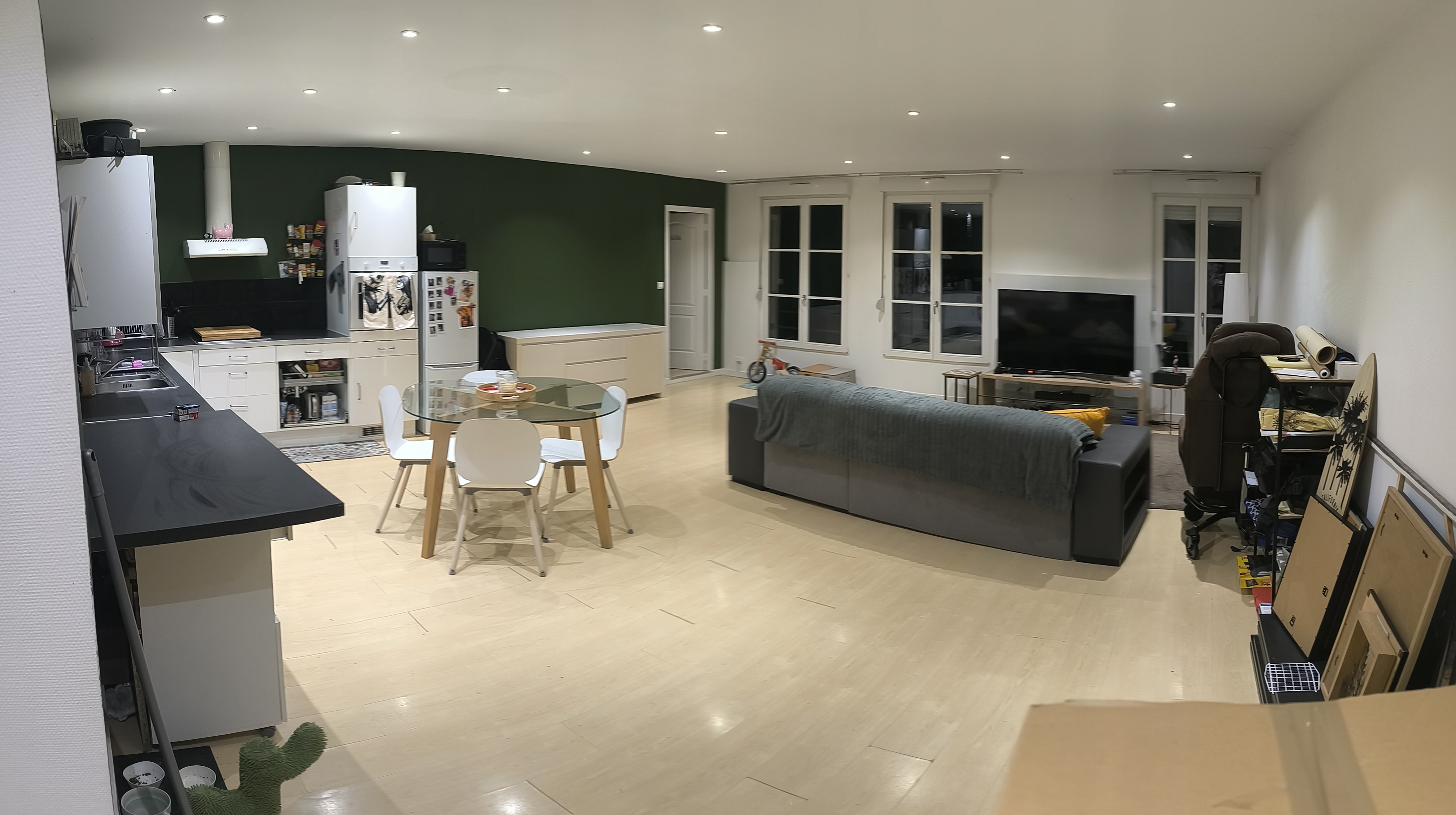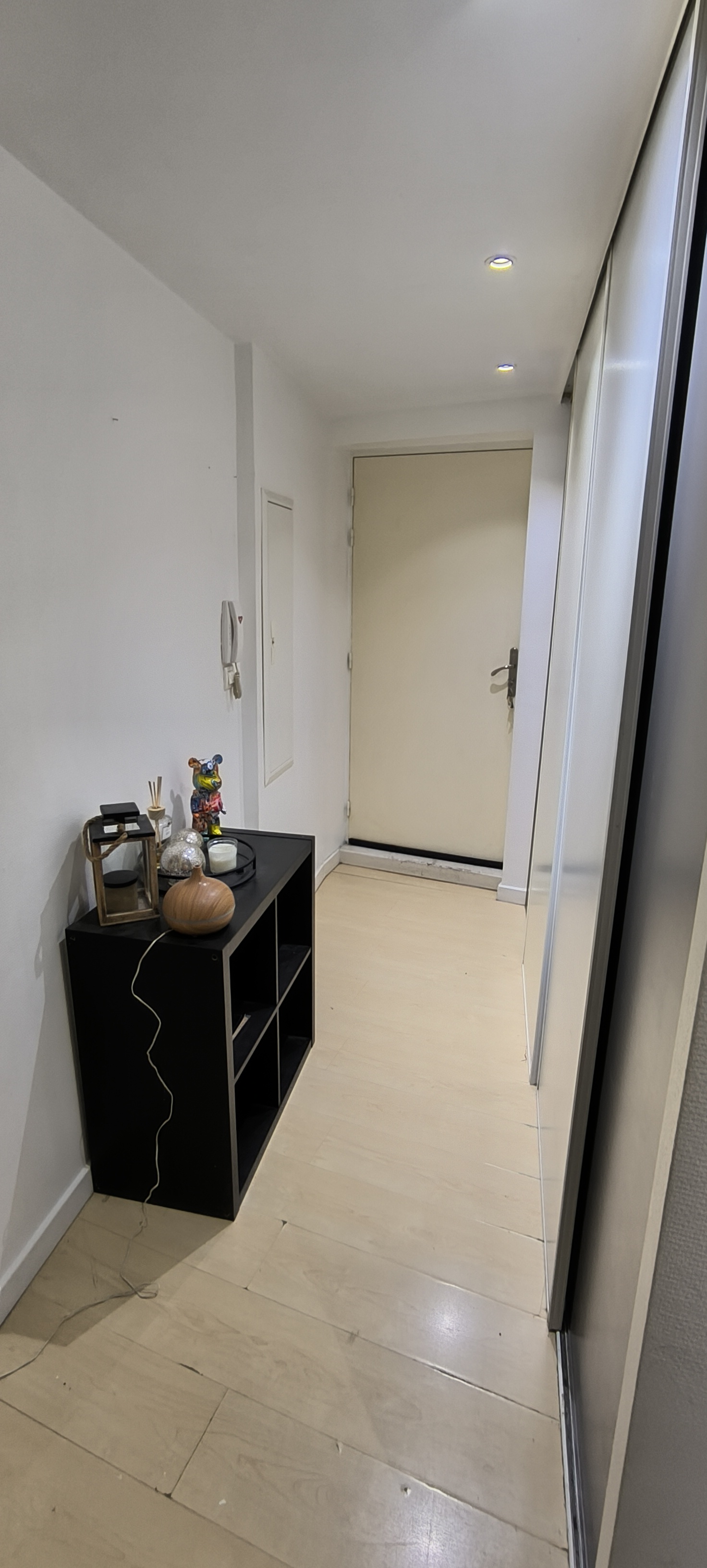 Appartement 5 pièces comprenant une entrée avec placard, une cuisine équipée (four, plaque, hotte, lave vaisselle) ouverte sur salon/séjour, une chambre avec placard et un WC séparé.