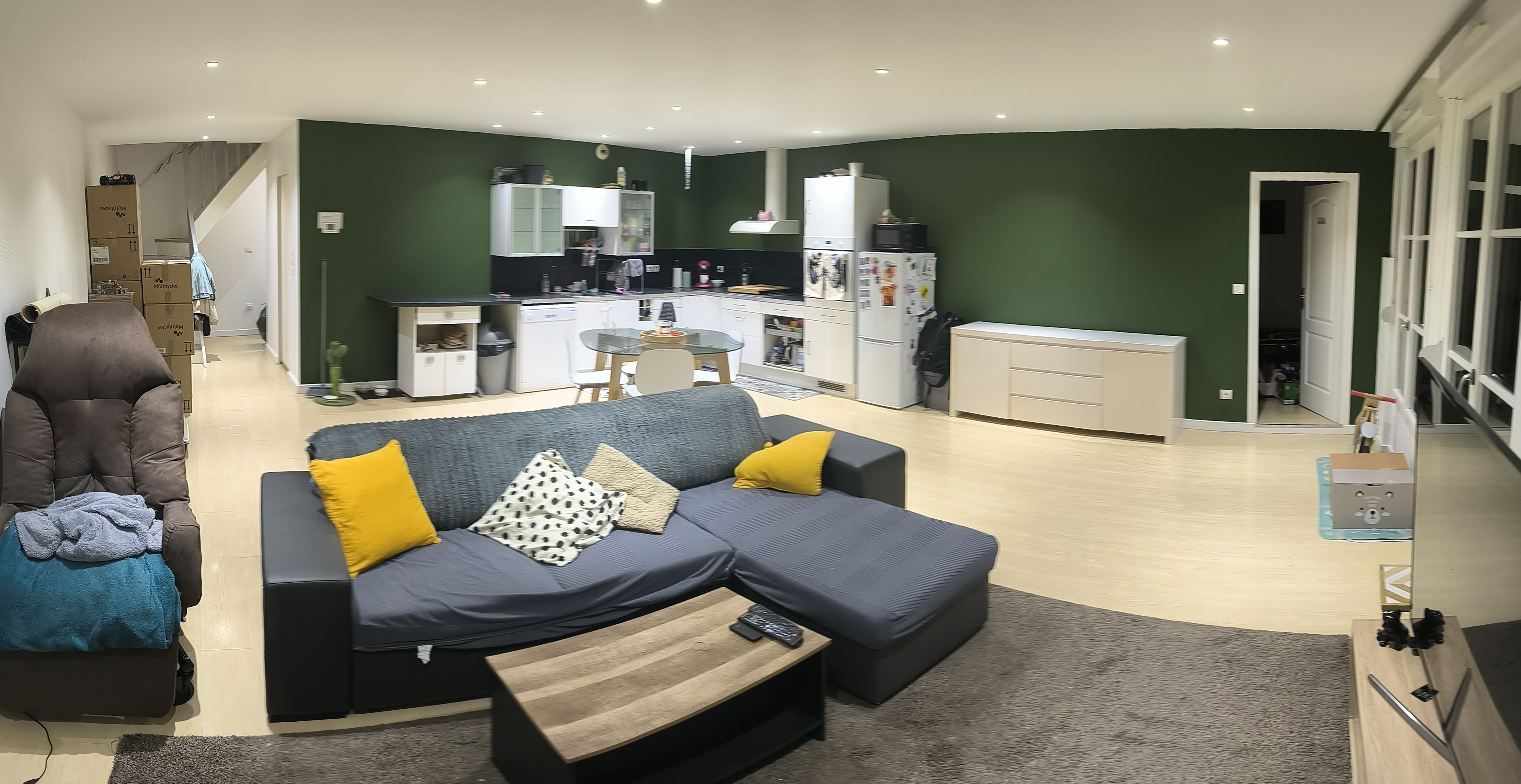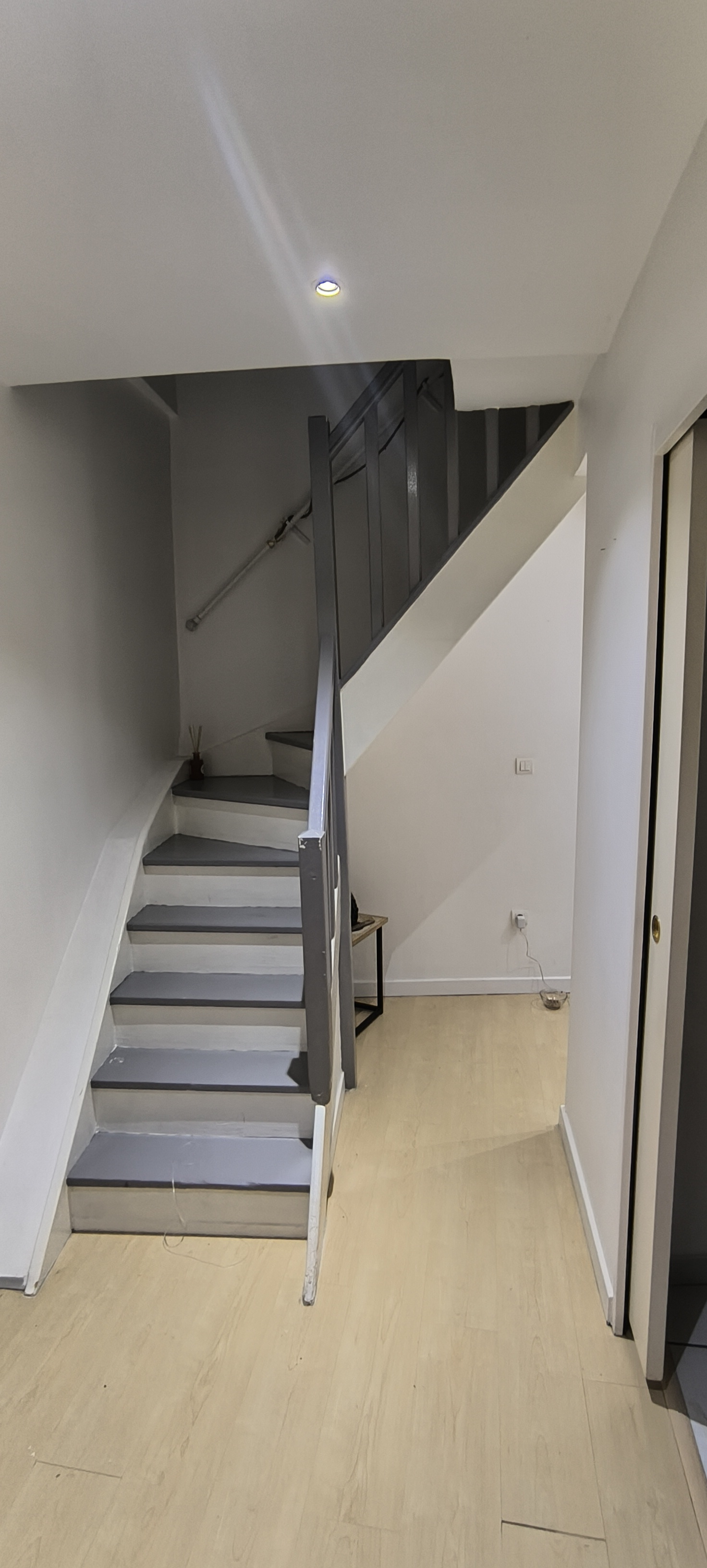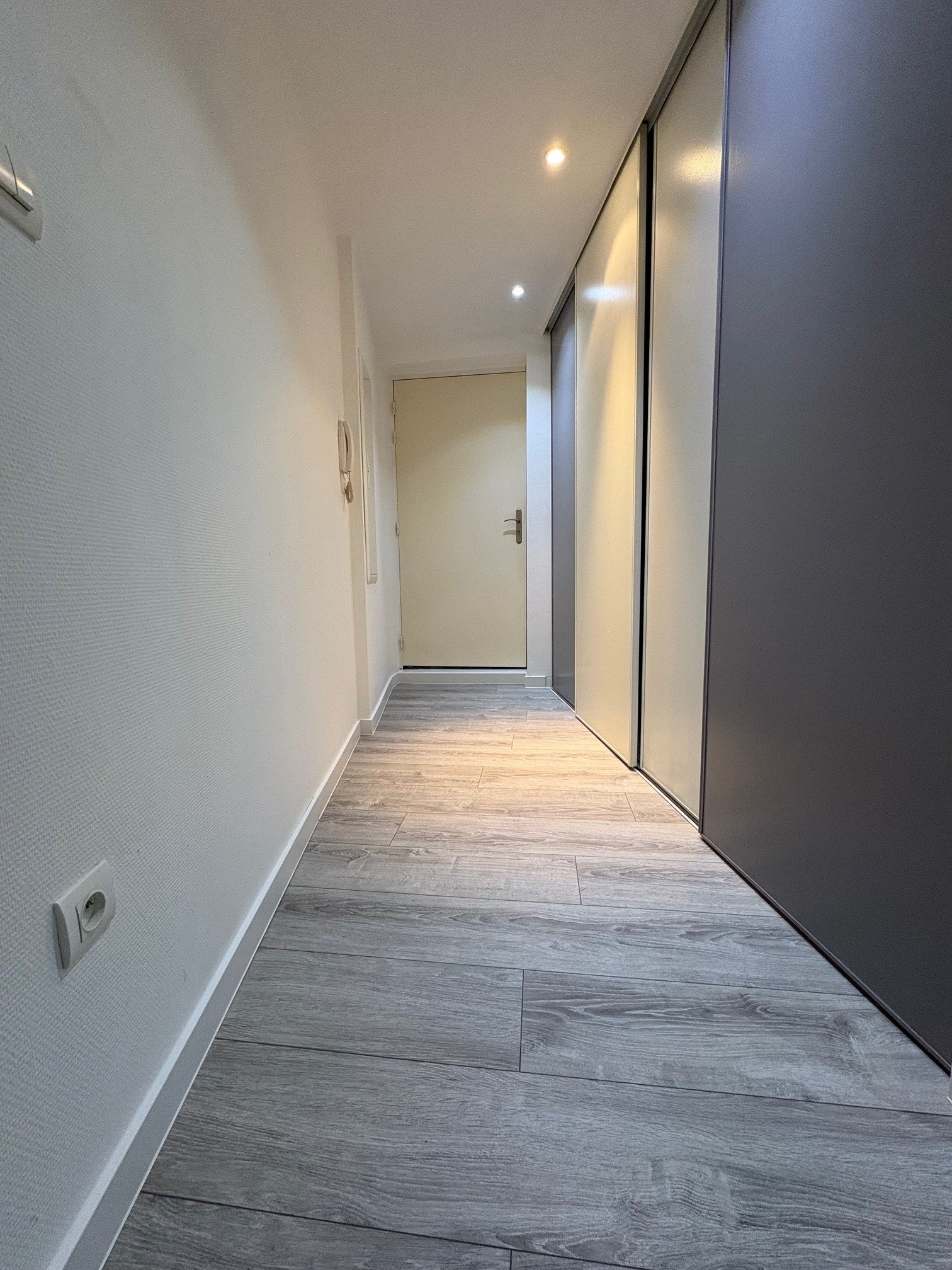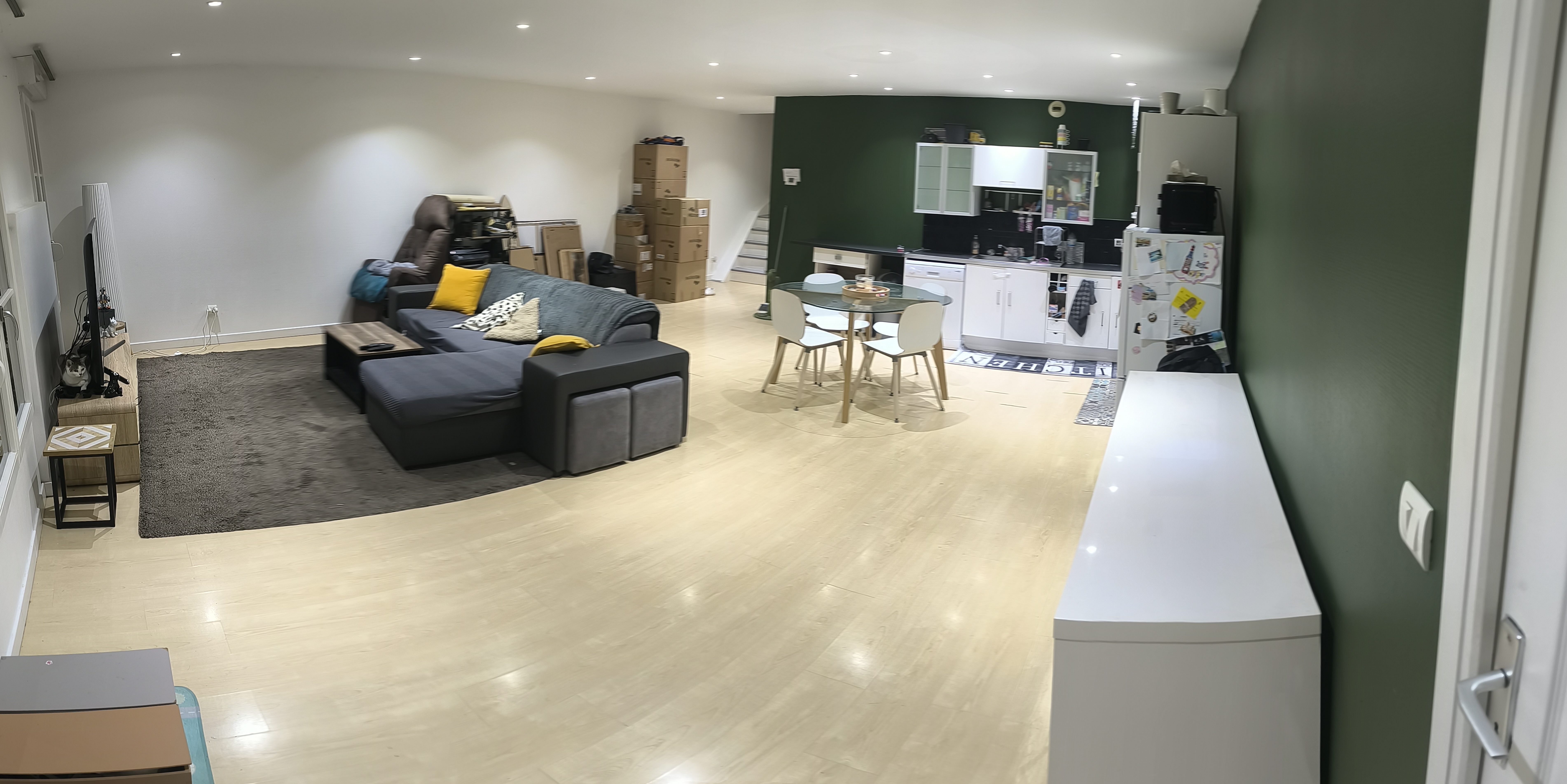 Appartement 5 pièces comprenant une entrée avec placard, une cuisine équipée (four, plaque, hotte, lave vaisselle) ouverte sur salon/séjour, une chambre avec placard et un WC séparé.