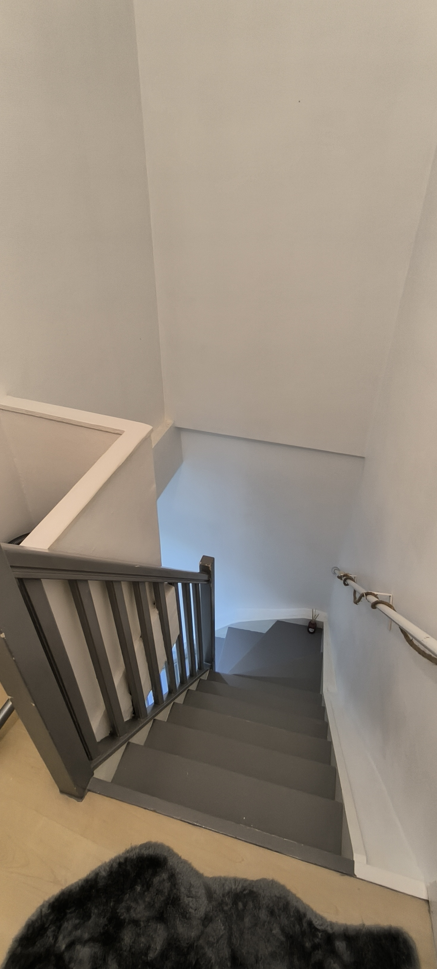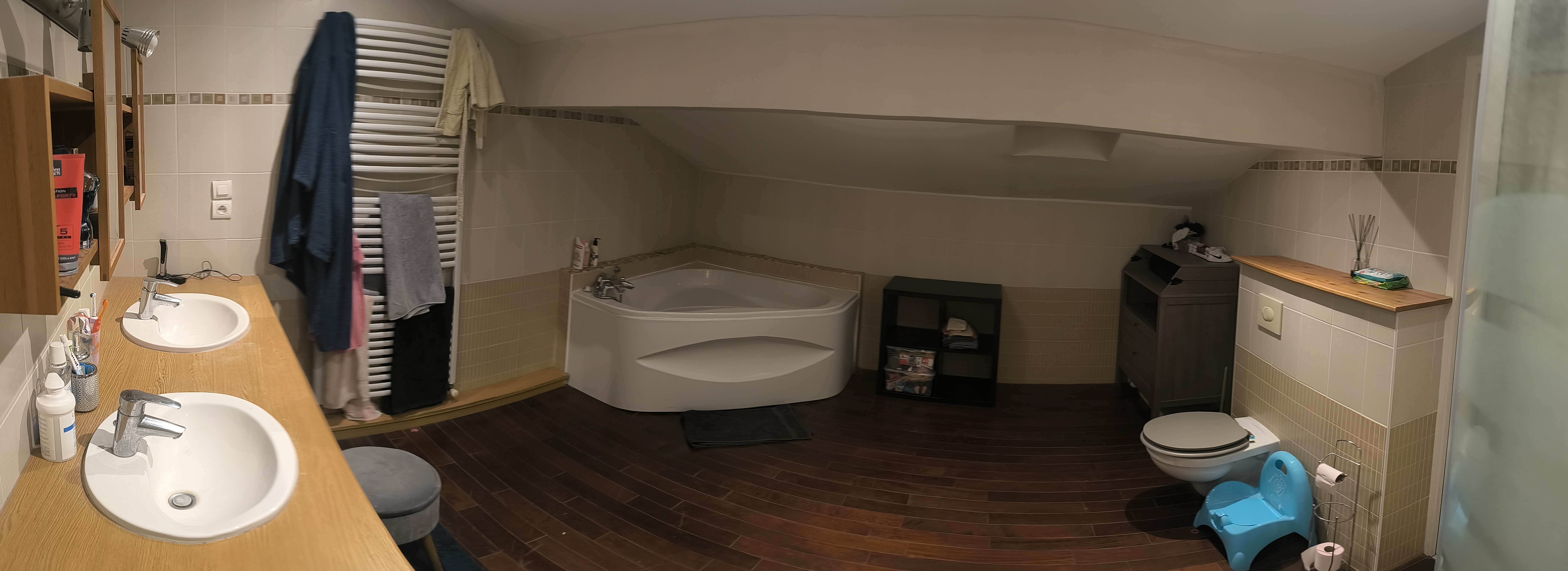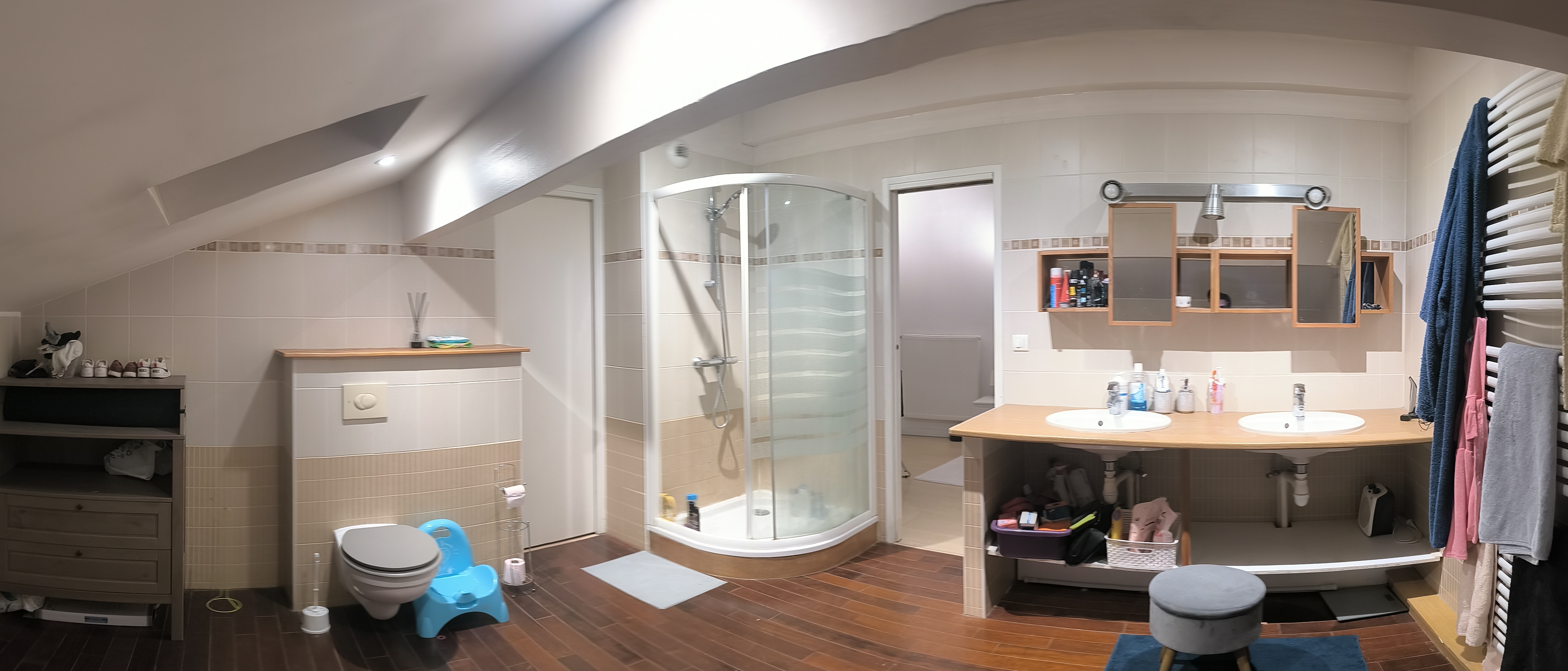 A l’étage: 2 chambres avec placard, une salle de bains avec douche et WC.